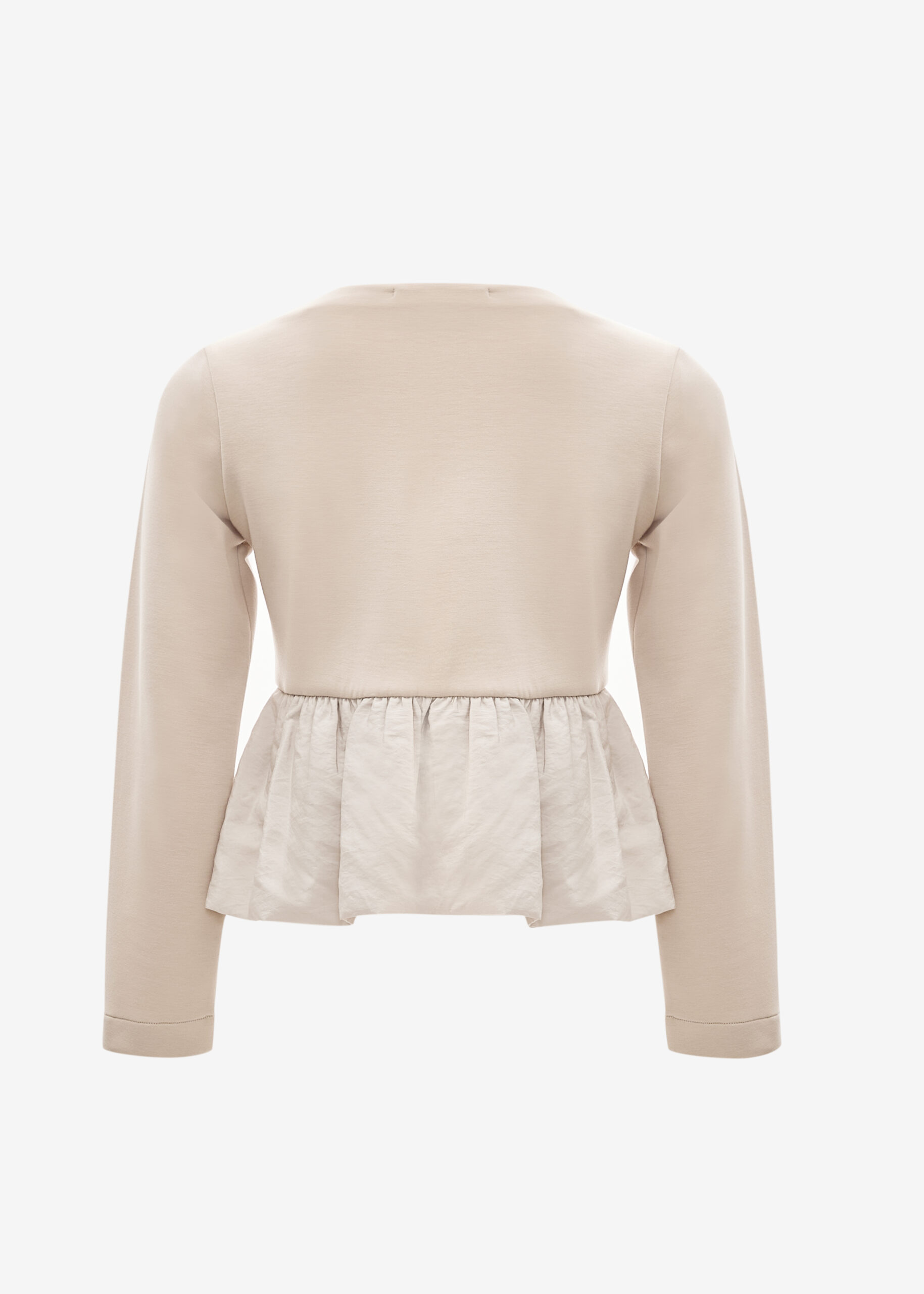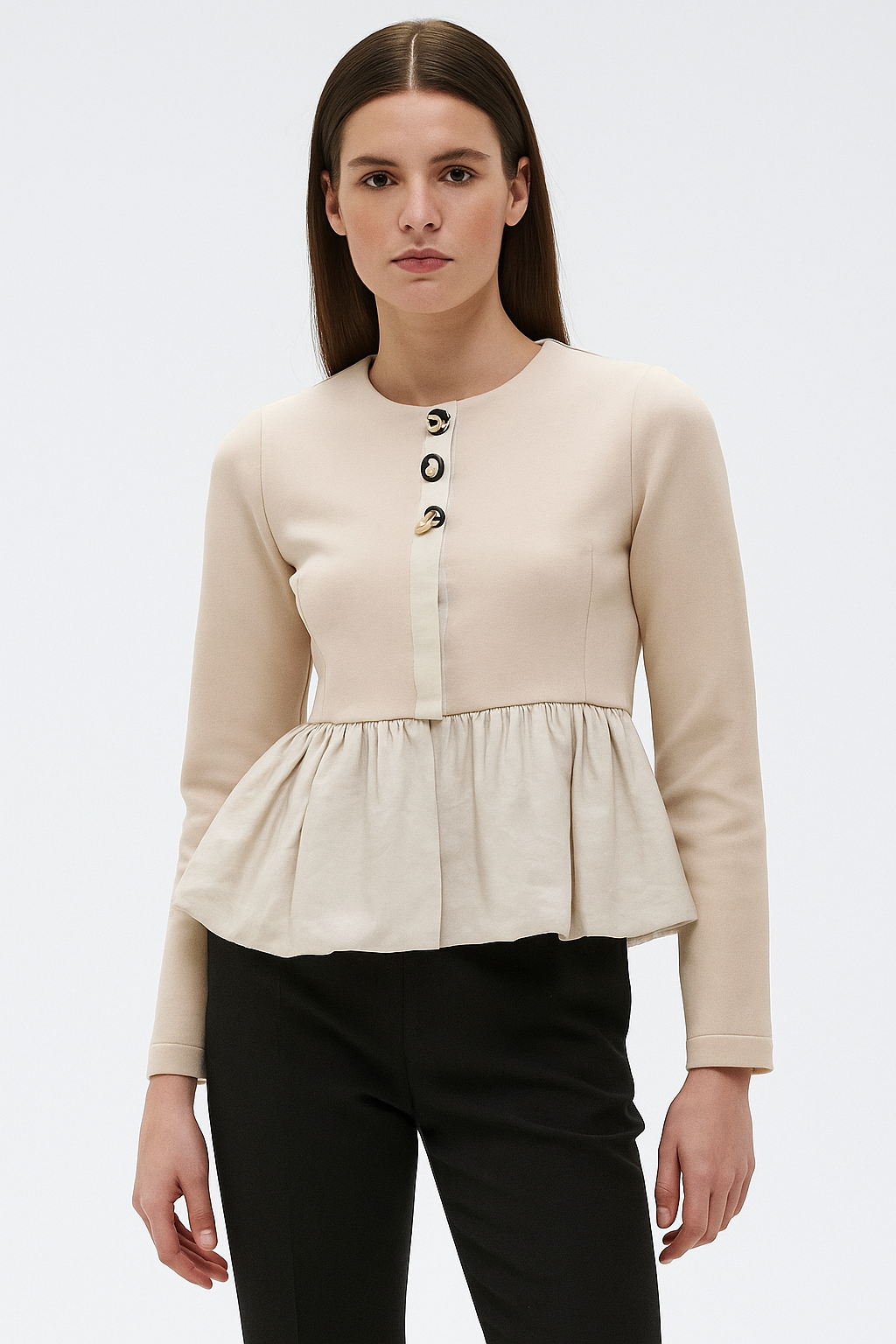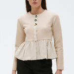 Eteği balon kumaş, üstü yumuşak modal dokulu bu düğmeli ceket-hırka; hem şık hem de sportif görünümü bir araya getirir. Vücudu saran konforlu kalıbı gün boyu rahat hareket imkânı sunarken, kaliteli düğmeleri uzun süre parlaklığını korur ve kararma yapmaz.