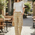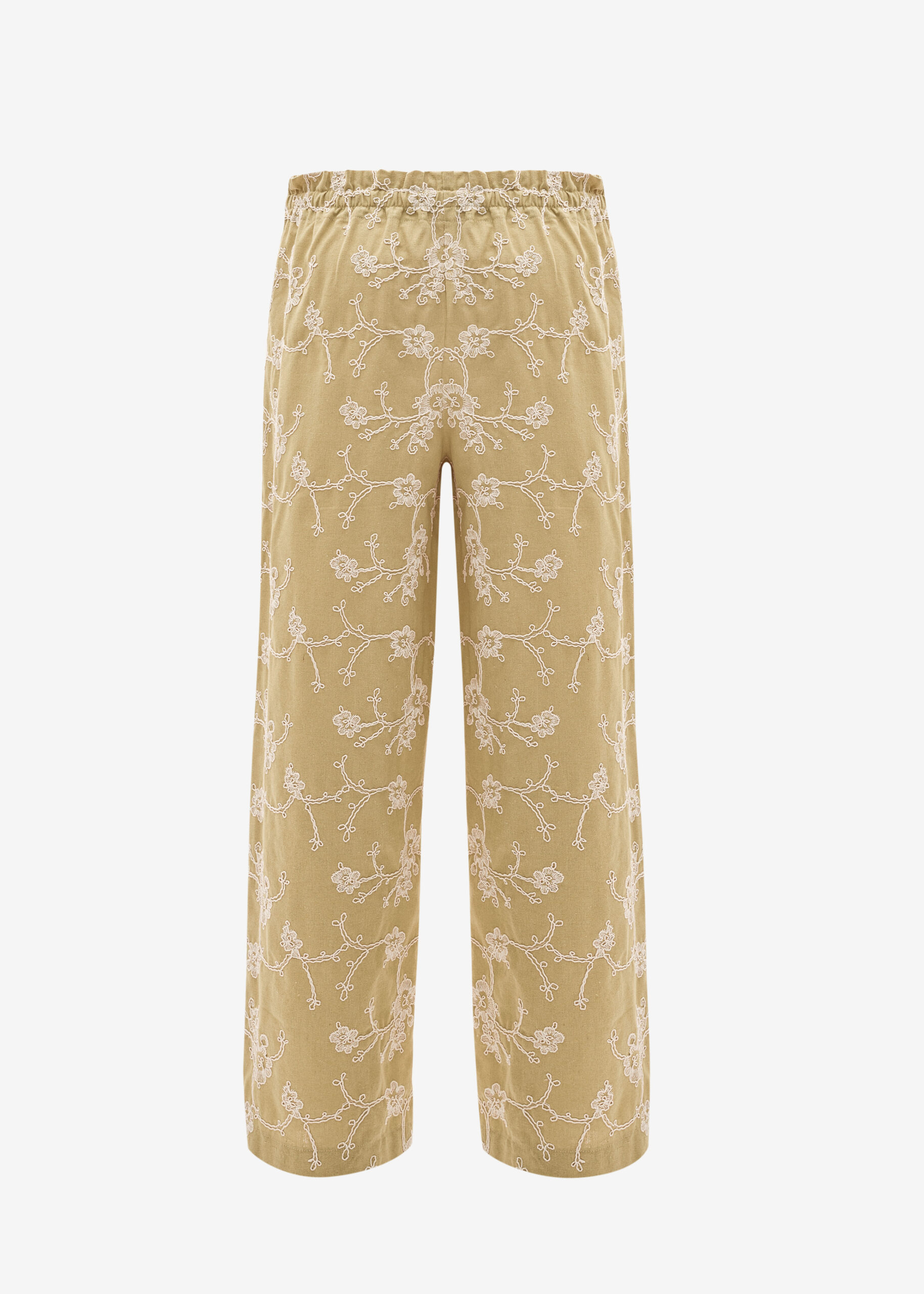 Keten Brodeli Pantolon, nefes alan hafif keten dokusuyla yaz ve sonbahar boyunca ferah bir kullanım sunar. Lastikli beli sayesinde gün boyu rahatlık sağlarken, cepsiz tasarımıyla temiz ve modern bir siluet yaratır. Astarlı yapısı ile iç göstermeyen tasarım, sofistike ve zahmetsiz bir şıklık sunar.