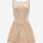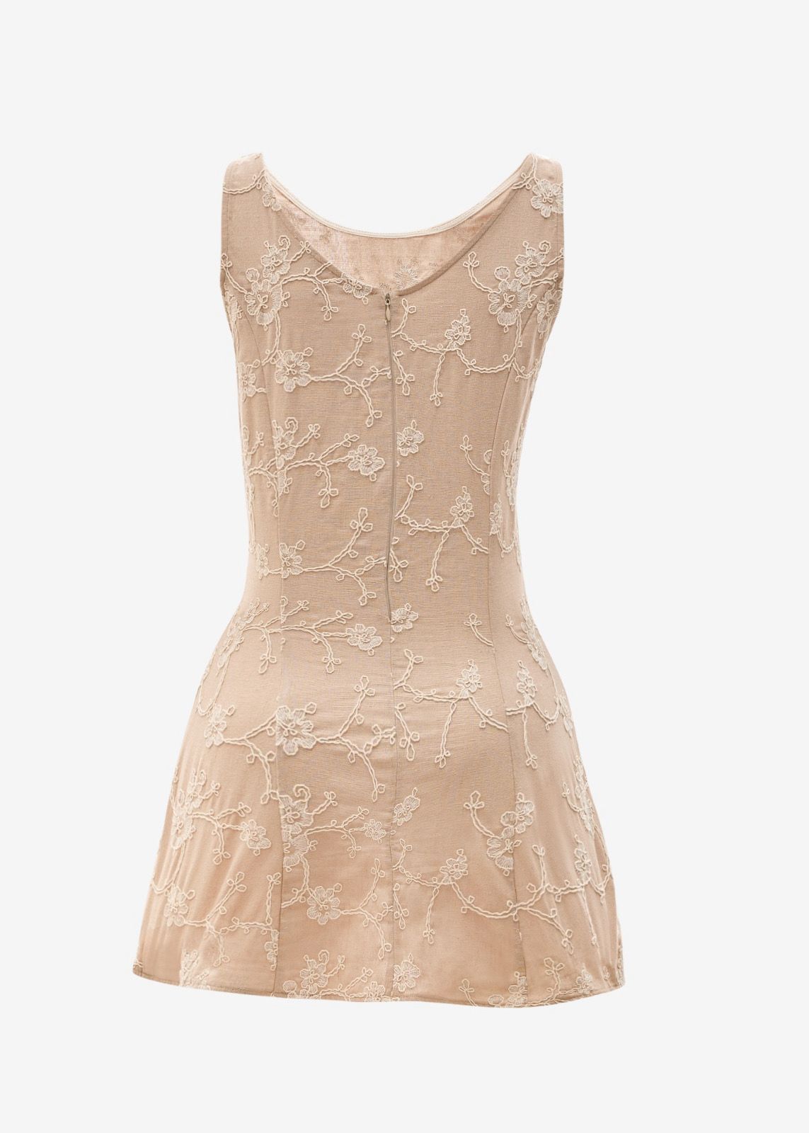 Tek yanında kafes dekoltesiyle dikkat çeken bu mini elbise, doğal keten dokusuna zarif brodenin eşlik ettiği şık bir tasarım sunuyor. Belden oturan ve aşağı doğru volanlı kesimiyle feminen bir siluet oluştururken, arkadan fermuarlı yapısı kolay giyim sağlıyor. Hafif ve nefes alan kumaşıyla yaz günlerinde hem rahat hem şık bir tercih sunuyor; günlük şıklık ve özel anlar için ideal.