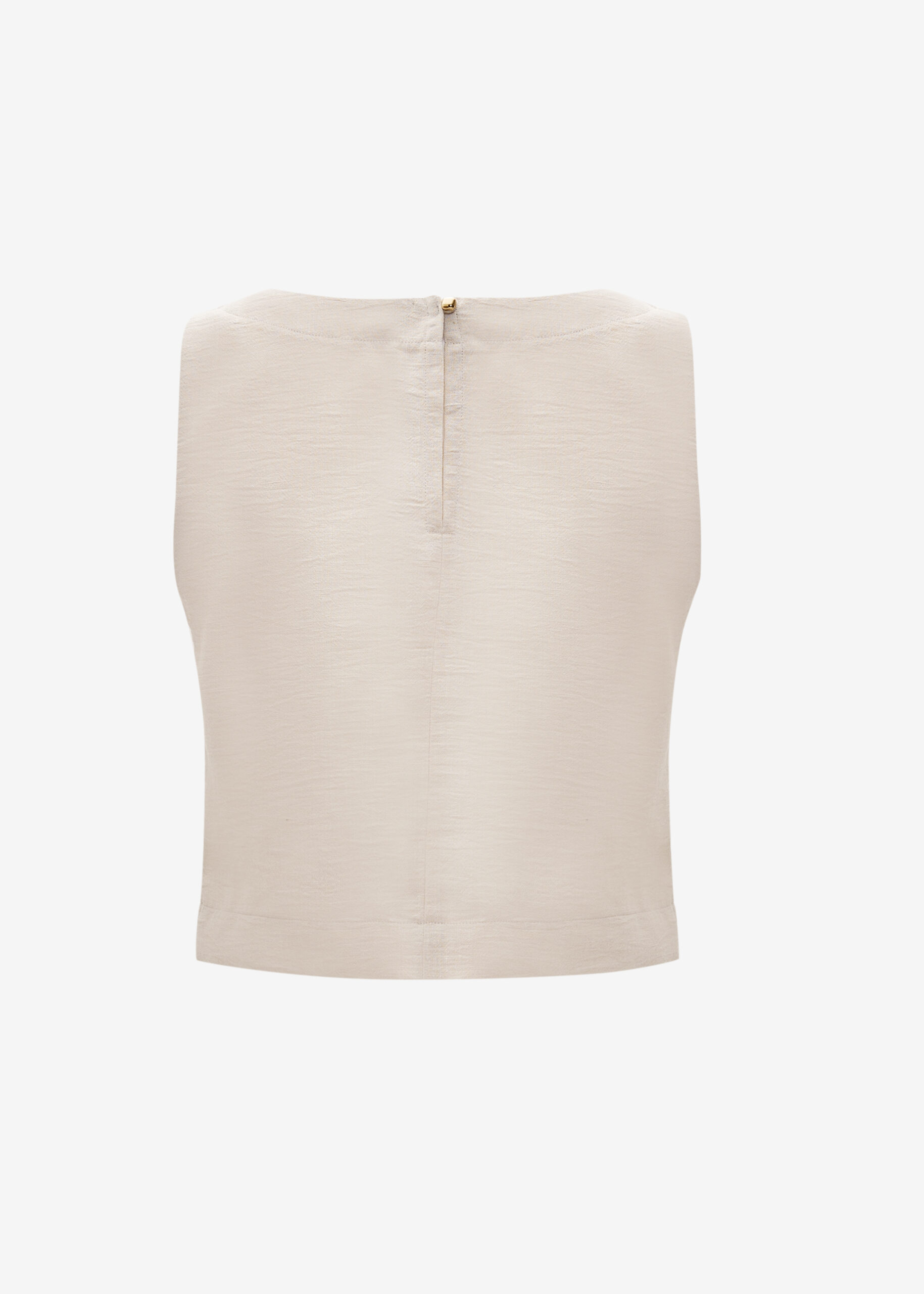 Doğal keten dokusuyla yaz günlerine ferahlık katan bu kolsuz bluz, arka kısmındaki pencere yırtmaç ve tek düğme detayıyla zarif bir şıklık sunar. Minimalist tasarımını tamamlayan broş aksesuar, parçaya modern  dokunuş ekler. Hafif yapısı sayesinde gün boyu rahat kullanım sağlarken hem günlük stilinize hem de özel anlarınıza eşlik eder.