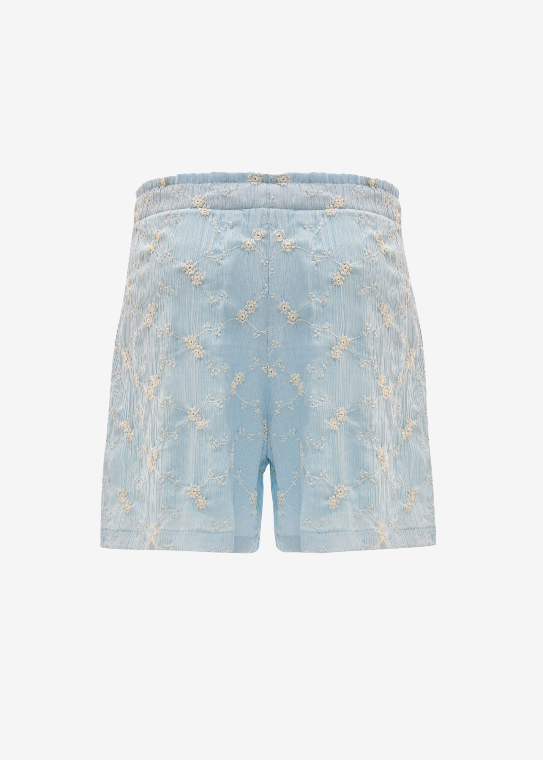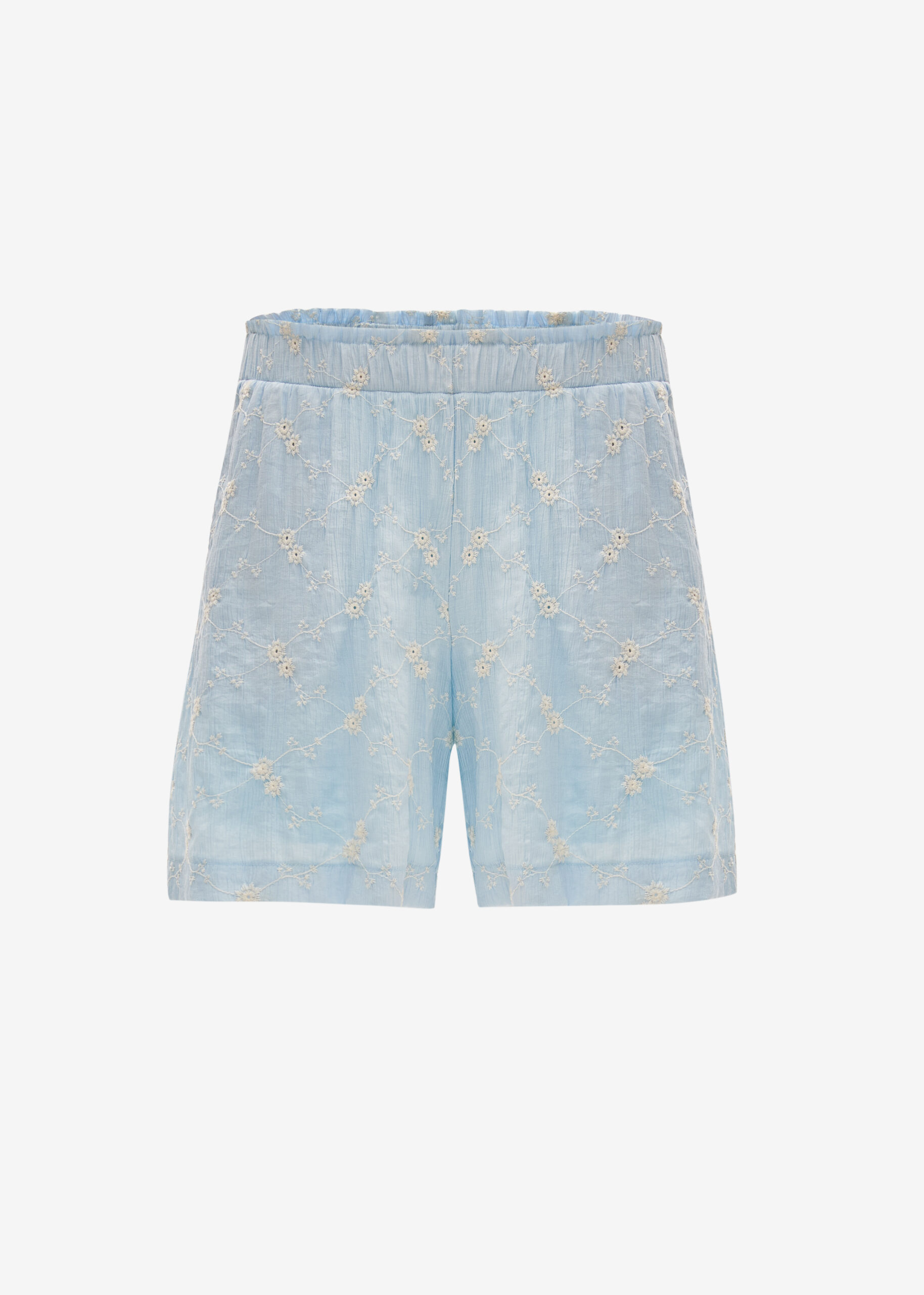 Zarif nakış detaylarıyla öne çıkan bu dökümlü şortlu takım, modern ve feminen çizgiyi bir araya getiriyor. Üst kısmındaki büzgü detayı ve önün kısa, arkanın uzun tasarımı hareketli bir siluet yaratırken, derin V yaka tasarıma sofistike bir hava katıyor. Alt parça ise astarlı yapısı ve cepli şort formuyla hem pratik hem de konforlu bir kullanım sunuyor. Günlük stilinize şıklık katmak için ideal olan bu takım, hafif ve akışkan dokusuyla tatil kombinlerinden şehir şıklığına kadar çok yönlü bir kullanım sağlıyor.