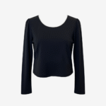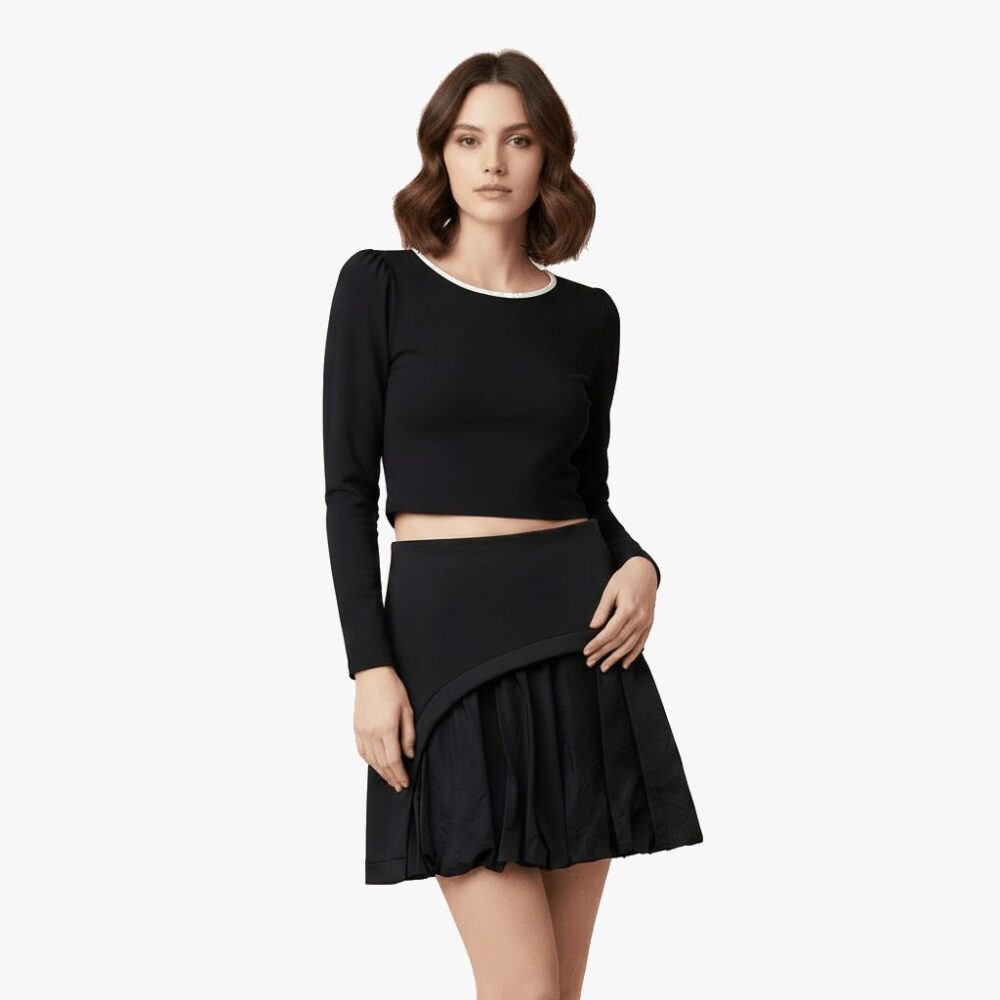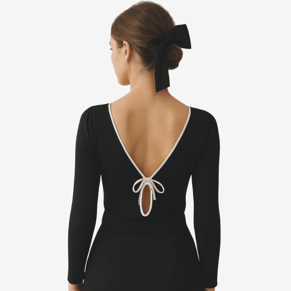 Sade çizgilerle şıklığı buluşturan bu siyah bluz, arkadaki derin sırt dekoltesi ve beyaz biye detaylarıyla modern bir kontrast sunar. Super model kumaşın tok ama esnek dokusu, vücudu zarifçe sararken gün boyu konfor sağlar. Hem günlük kombinlerde hem de akşam davetlerinde dikkat çekici bir duruş yaratır.