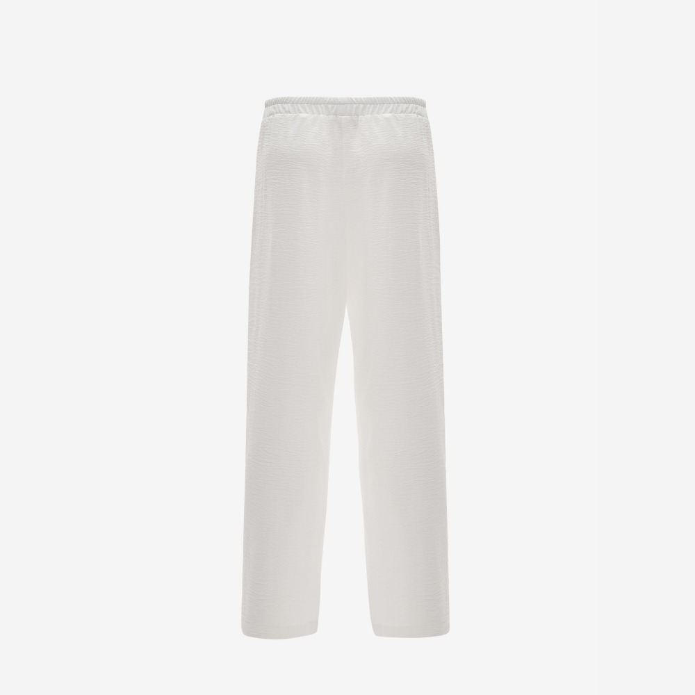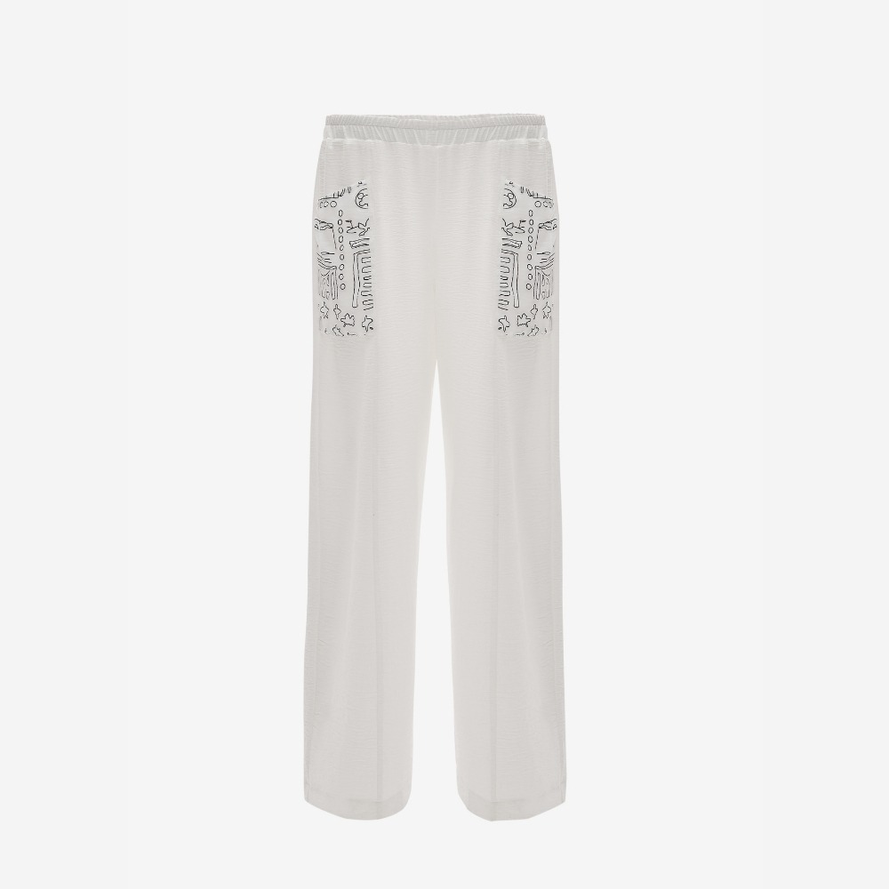 VAURA’nın sade ama güçlü çizgisini yansıtan bu beyaz ayrobin pantolon, hafif dokusu ve akıcı formuyla gün boyu konfor sunar. Üzerindeki modern illüstratif cep baskıları tasarıma sanatsal bir karakter katarken, dökümlü kesimiyle hem rahat hem de zarif bir siluet oluşturur. Yüksek bel ve lastikli bel formu sayesinde her vücut tipine uyum sağlayan bu parça, şehir stilinden tatil kombinlerine kadar her ortamda fark yaratan bir şıklık sunar.