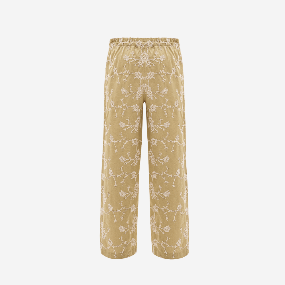 Keten Brodeli Pantolon, nefes alan hafif keten dokusuyla yaz ve sonbahar boyunca ferah bir kullanım sunar.; Lastikli beli sayesinde gün boyu rahatlık sağlarken, cepli tasarımıyla modern bir siluet yaratır.; Astarlı yapısı ile iç göstermeyen tasarım, sofistike ve zahmetsiz bir şıklık sunar.