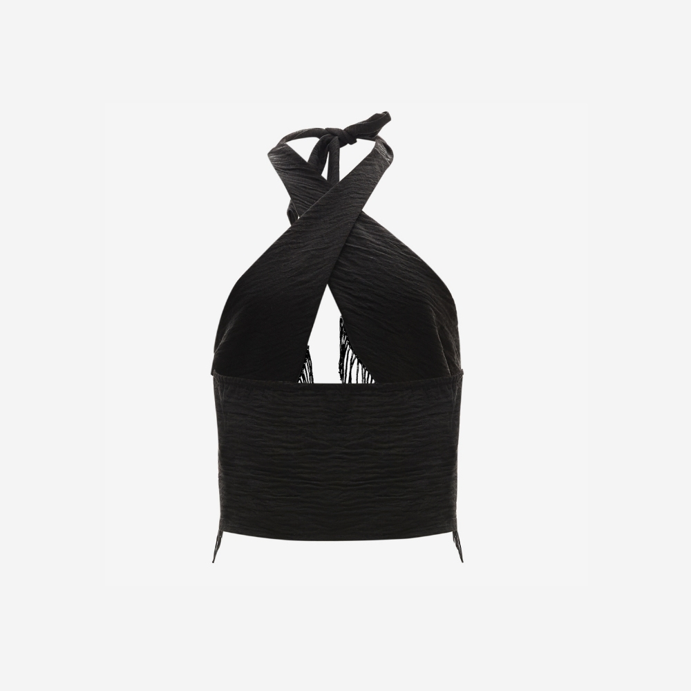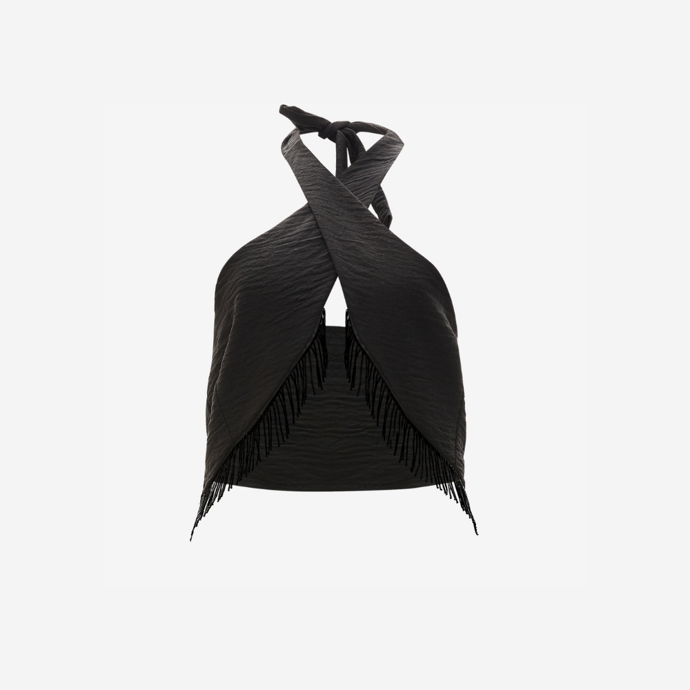Işıltılı boncuk saçaklarıyla dikkat çeken Bağlamalı Crop Bluz, cesur ve zarif çizgileriyle VAURA kadınının özgüvenli duruşunu yansıtır. Siyahın zamansız asaleti ve detaylarıyla birleşerek ışıltılı ama dengeli bir şıklık sunar.
