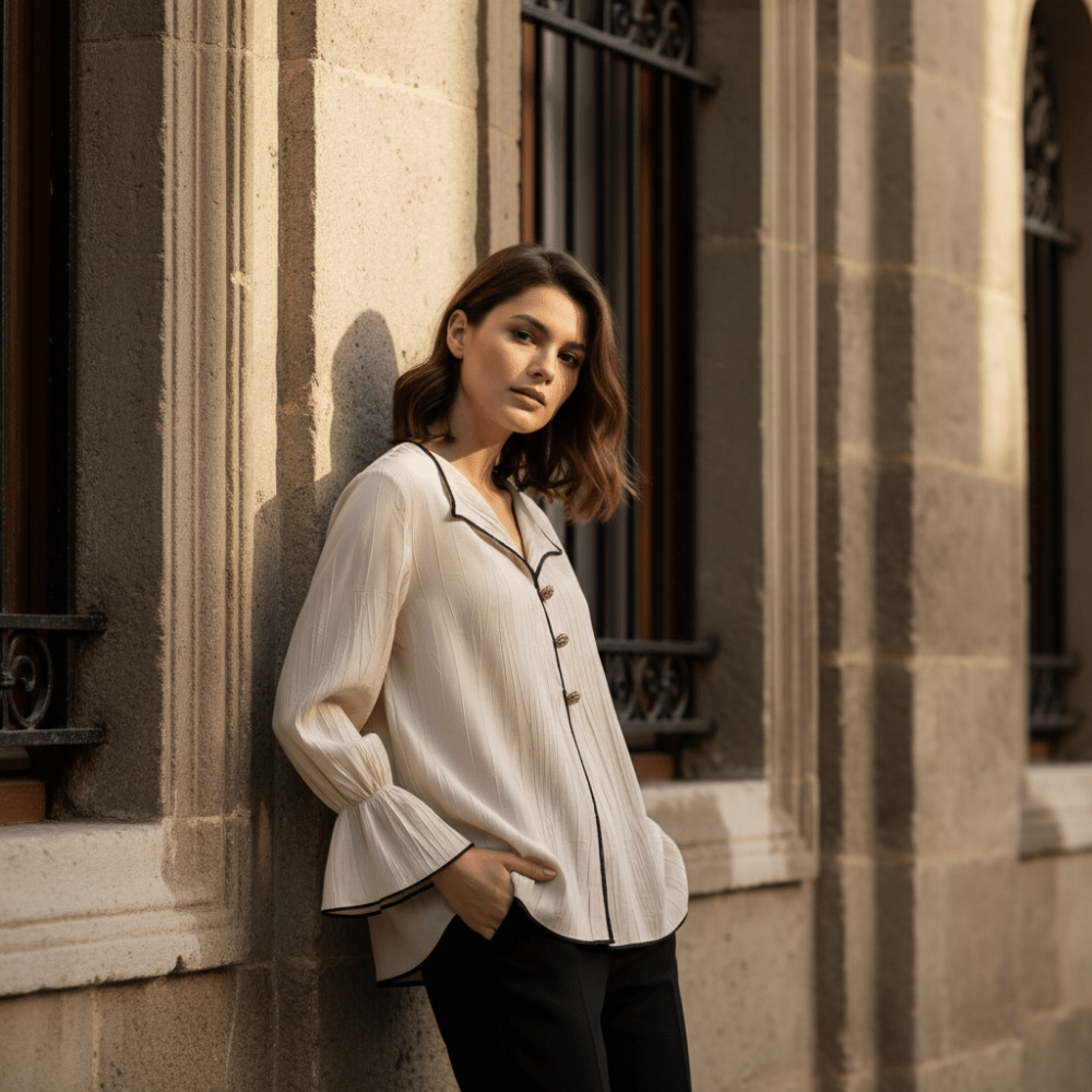 VAURA’nın zarafetle tasarladığı bluz, ipek dokulu saten görünümlü kumaşıyla teninize lüks bir dokunuş sunar.; Siyah kontrast biyeler ve zarif altın düğmeler, tasarıma güçlü bir karakter kazandırır